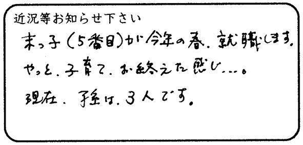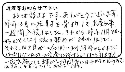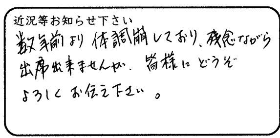 欠席者からのメッセージ 松下 政子(旧姓 石垣) ![]() 大野 みどり(旧姓 保坂) ![]() 大石 ゆかり(旧姓 久保) ![]() 久保 幸江(旧姓 石黒) ![]() 鈴木 洋子 ![]() 井上 紀子(旧姓 橋本) ![]() 鳥原 純子(旧姓 吉川) ![]() 小城 三津子(旧姓 橋本) ![]() 山田 雪代(旧姓 徳田) ![]() 田部 秀子(旧姓 牧野) ![]() 高堂 洋子(旧姓 中西) ![]() 渡邊 かがり(旧姓 岡本) ![]() 井上 典子(旧姓 北村) ![]() 笹谷 美子(旧姓 喜多) ![]() 中森 生子(旧姓 堀田) ![]() 宮本 泰子(旧姓 和久田) ![]() 今回の同送会の欠席者のメッセ−ジは2019年度幹事さんから 頂きました資料から記載させて頂きました。 大切なデ−タを使わせて頂きます。 |
