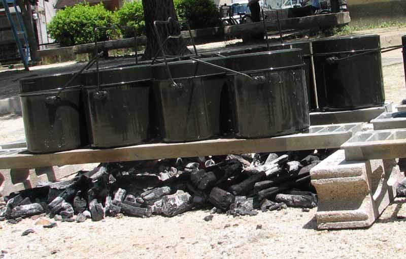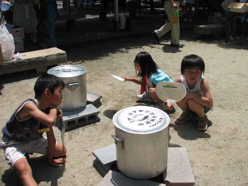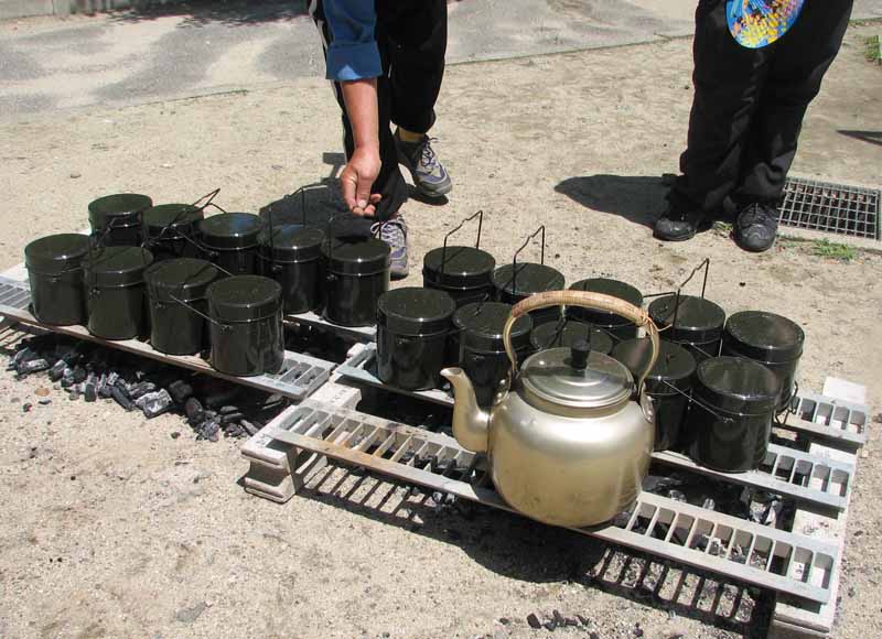 丸い飯ごうが並んでる