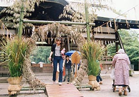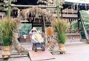 | 車椅子を押して茅の輪くぐり。