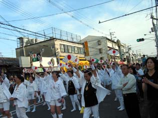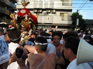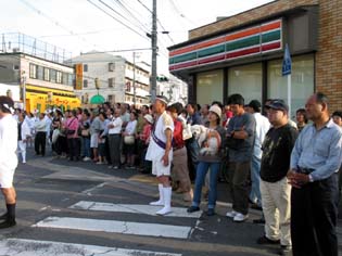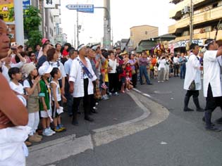 道路の両側いっぱいの見物 真ん中はギャルが男性神輿の音頭をとっている