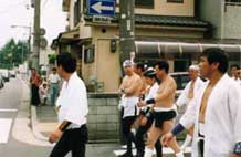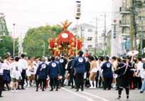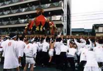 - 揃いの法被に黒パッチ、豆絞りの鉢巻きに胴巻き、地下足袋に身を固めた100名余りの男達に担がれた御輿は「さいりょう さいりょう」のかけ声と共に、直進・蛇行・揺さぶり・両手で差し上げたりを繰り返しながら街道を練りました。