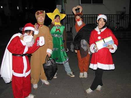 クリスマスイブに、児童館の職員は女子中学生らと一緒にサンタさんに扮して幼児のいるお宅を訪問しました。