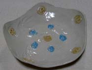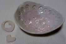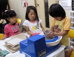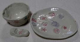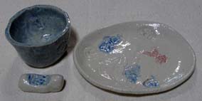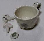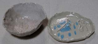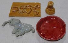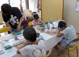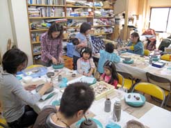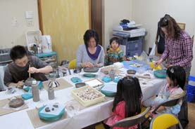 | 人気キャラクタ−印や印花・白化粧土で装飾を楽しんで頂けます。 | 出来上がった作品は持帰り、素焼き・釉がけ後本焼きします。 |
