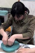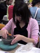 | 人気キャラクタ−印や印花で装飾を楽しんで頂けます。 | 出来上がった作品は持帰り、素焼き・釉がけ後本焼きします。 |