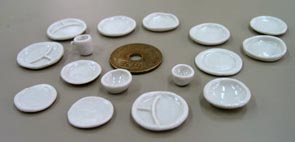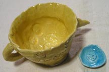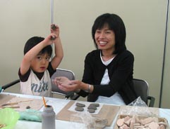 | 人気キャラクタ−印や印花で装飾を楽しんで頂けます。 | 出来上がった作品は持帰り、素焼き・釉がけ後本焼きします。 |